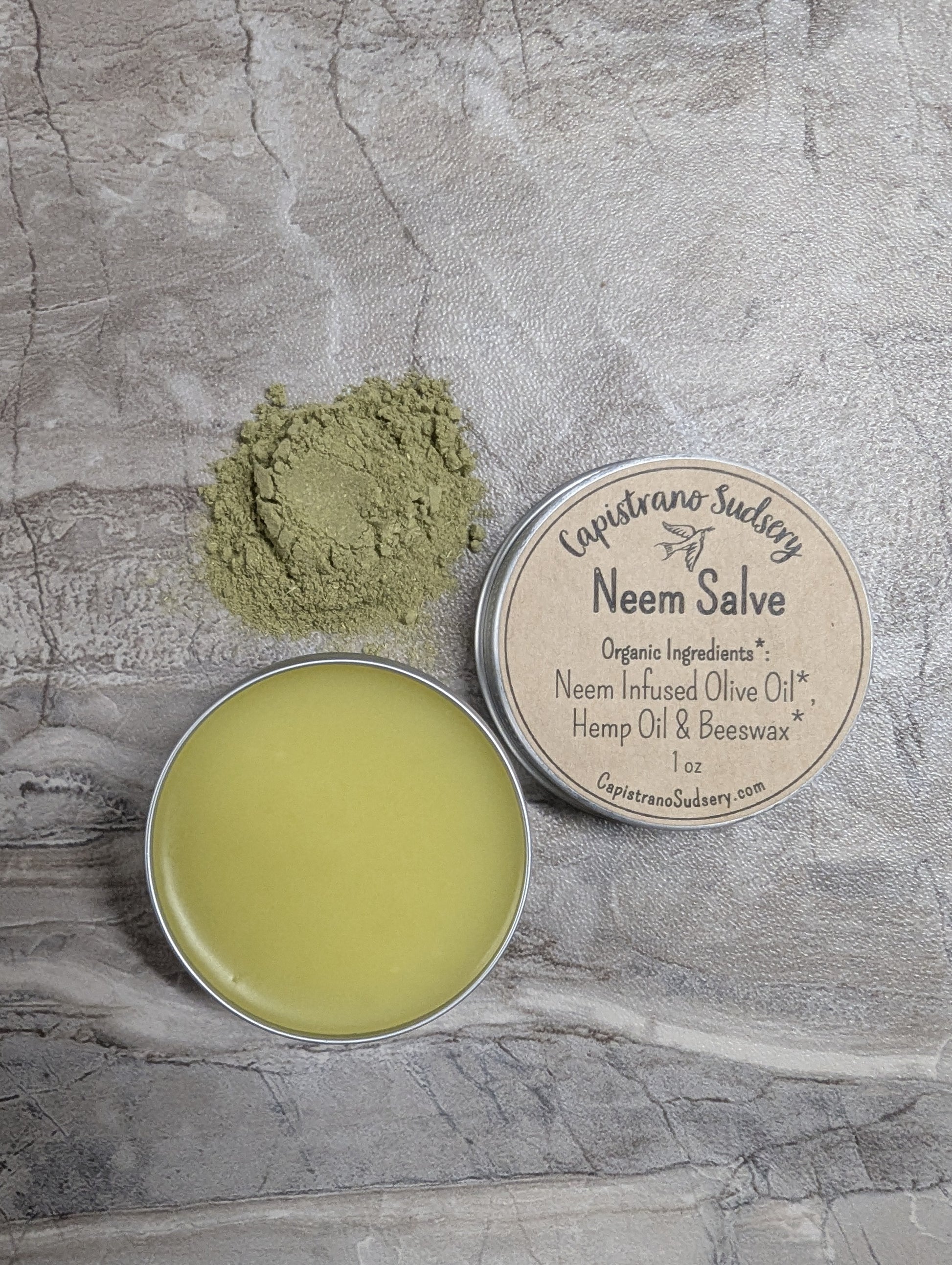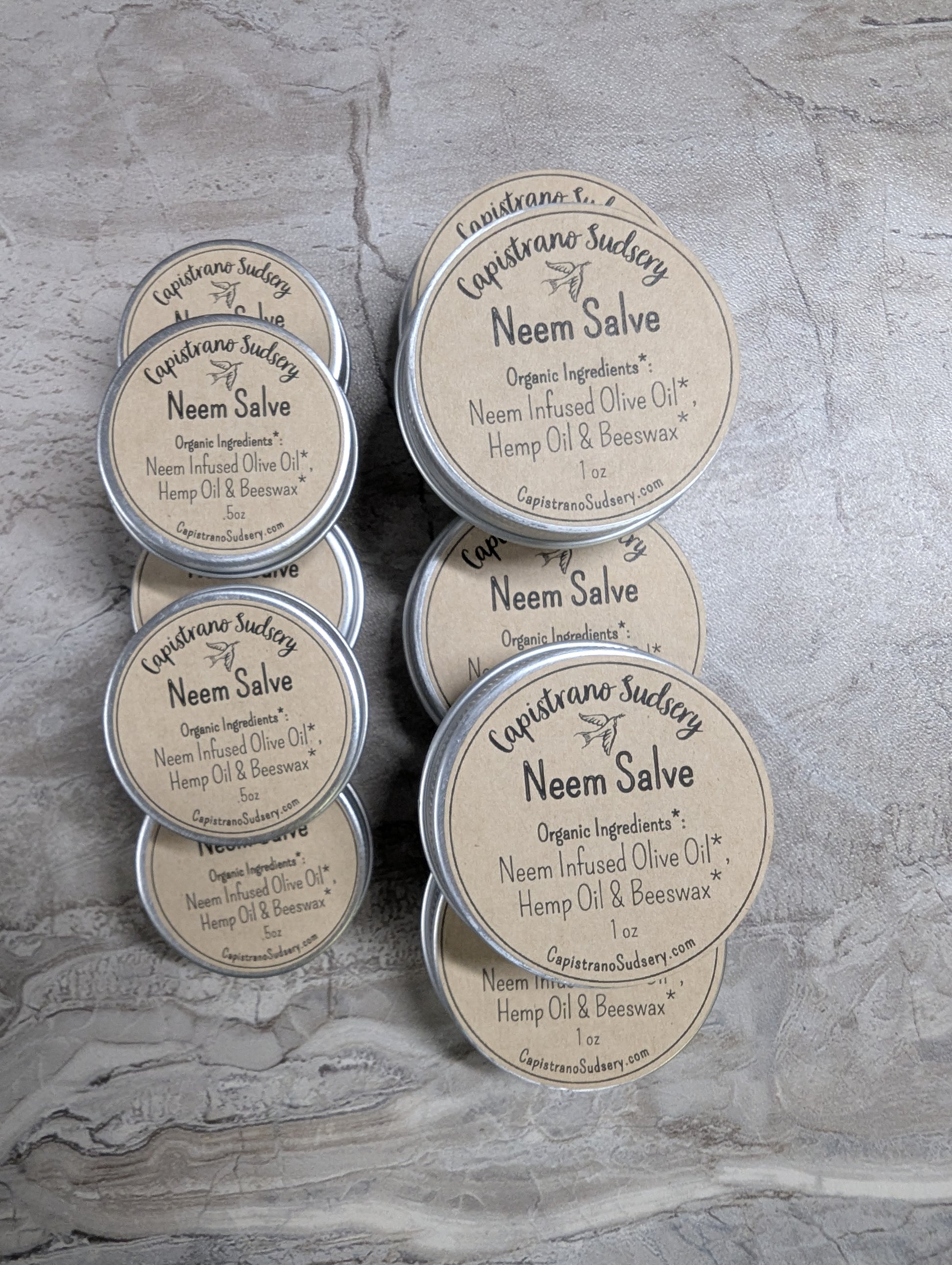 The neem is infused in organic olive oil for months and stored in a dark cool place until it's ready to be made into a salve. Hemp oil and organic beeswax is also added to this salve.